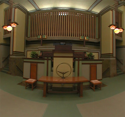Frank Lloyd Wright Unity Temple ProjectI have long been an admirer of Mr. Wright's work. The Unity Temple was his first public building. One of the things I like about it is that it is still in use by the same group that originally had it built. The purpose of this site is to have you, the engagers of this work, tag the panorama of the Unity Temple with your thoughts and ideas about the space and Mr. Wright. There are 256 hotspots which can contain comments. Once a spot is filled, its' comments will appear on rollover. If a spot hasn't any comments, alt/option click on it and add your own. Comments, questions or problems can be directed to me at dbarth@dbnewmedia.com Technical needs